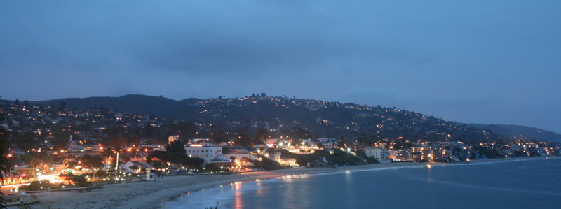 Along the Pacific Coast Highway in Orange County is the city of Laguna Beach. It was an overcast day, but it was still nice to relax atop a large rock and watch the waves come crashing ashore. The beaches are beautiful, surrounded by palm trees and large rocks in the water and the town is lined with small shops, restaurants and art galleries. As the day got darker, I took this photo from a gazebo overlooking the Laguna Beach coast.