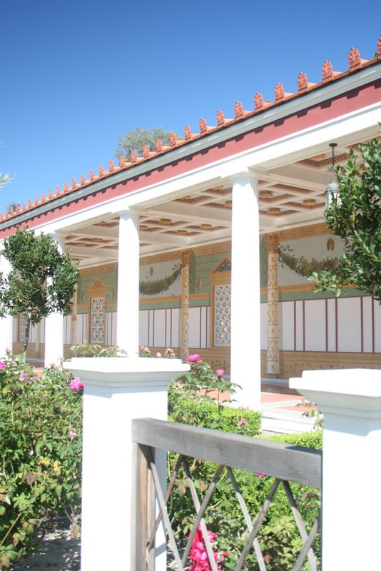 Along the Pacific Coast Highway, hugging the Pacific Ocean Coast, is the Getty Villa. It is an educational center and museum dedicated to the study of the arts and culture of the ancient Greece, Rome and Etruria. Walking through the grounds of the Villa is a mixture of outdoor architecture and indoor arts. This photo was of the main courtyard surrounding a crystal clear blue pool with statues in it. It was built as a secondary location to the Getty Museum in Brentwood.