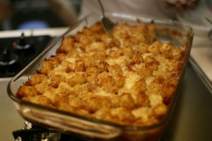 Yes, to answer your question, it does taste as delicious as it looks! My cousin, Amanda, brought up the idea of cooking jambalaya, and I thought of this tater tot casserole that I had seen pictures of in her food album. We layered the tray with chili and hot dog slices, topped it with extra crispy tater tots and covered it with cheese. Baked it in the oven and there you go. Yummm! =P